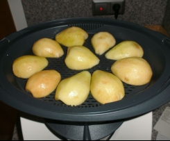 3 Sek./ St.10 zerkleinern, umfüllenBirnen schälen, entkernen halbieren, in den Varoma-Einlegeboden legen und mit Zitronensaft beträufeln