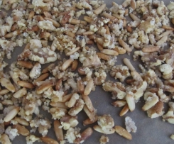 Pinien- und Walnusskerne (man kann auch nur eine Sorte nehmen oder auch gehackte Mandeln...) in einer Pfanne ohne Fett hell rösten. Den Zucker über die Kerne streuen und unter Wenden karamellisieren lassen. Auf einem Streifen Backpapier auskühlen lassen.