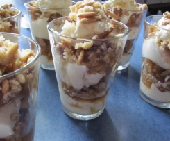 Die Creme abwechselnd mit dem Apfelmus und dem Krokant in die Gläser schichten (in meine passen 220 ml). Mit Creme und Krokant enden. Die Gläser ca. 1/2 Stunde kühl stellen.