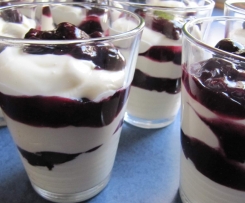 Die gut durchgekühlte Creme abwechselnd mit den Heidelbeeren in Gläser schichten. Ich habe 8 Stück à 220 ml genommen.