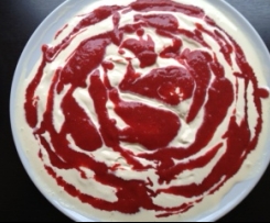 Die Erdbeersoße zügig spiralförmig darüber träufeln. So sieht es dann aus: