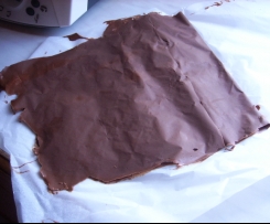 Die Schokoglasur schmelzen ,und auf ein mit Backpapier ausgelegtes Backblech geben und sehr dünn verstreichen . und 50 Minuten kaltstellen .