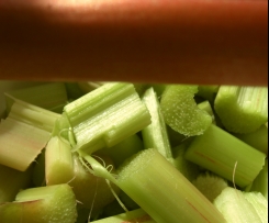 Den Rhabarber (waschen), abziehen und in daumennagel-dicke Stücke schneiden. 300 g/ml Wasser in den Mixtopf geben, den Gareinsatz mit den Stückchen füllen, den Rest in den Varoma-Einsatz geben.