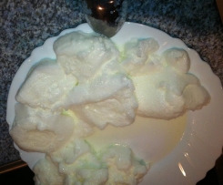 300 ml Milch mit Zucker und Vanillinzucker verrühren und in einem kleinen Topf zum Kochen bringen. Mit einem Esslöffel Portion Eiweissschnee abstechen und in die heisse Milch legen. Kurz ziehen lassen und dann wenden.