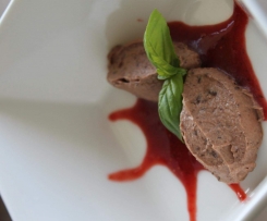 Auf einem Teller die Soße als Spiegel anrichten und das Schokodessert als Nocken aufsetzten.