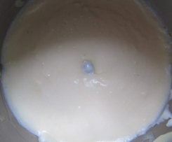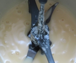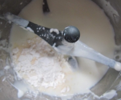 Den Rühraufsatz wieder einsetzen und Milch, Vanillepuddingpulver und Zucker in den