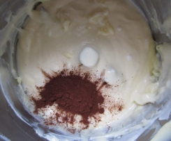 Die Hälfte der Creme umfüllen (bis ca. zur 1/2-Liter-Marke). Kakao zur restlichen Creme in den