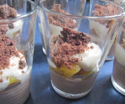 Abwechselnd Schokocreme, Obst, helle Creme und Keksbrösel in Gläser schichten (meine fassen 200 ml). Nach Belieben mit Schokosoße ... dekorieren und ca. 30 Minuten kalt stellen.