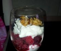 "Mixtopf geschlossen" umfüllen und nochmals 2Min/Stufe 2-3 vermengen.Im Wechsel Creme und gefrorene Himbeeren in ein Glas schichten, abschließen mit der Creme.