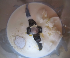 Sahne, Ei, Vanillezucker, Zucker und Frischkäse in den