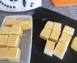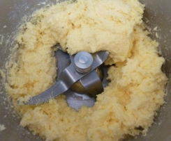 Würfel schneiden und höchstens die halbe Menge davon in den kalten Mixtopf geben und 3Sek./Stufe 8-9 zerkleinern...