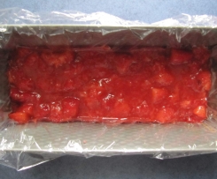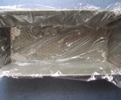 In der Zwischenzeit eine Kastenform (ca. 11 x 25 cm) mit Frischhaltefolie auslegen.