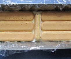 Die übrige Creme darüber gießen und die Löffelbiscuits mit den Fingern "untertauchen". Die Creme ist ziemlich flüssig, so dass die Kekse hochsteigen.