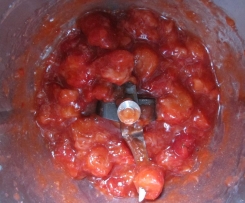 Die Waage auf 0 stellen, Erdbeersaft in den TM geben und mit Wasser auf 75 g auffüllen. Die Speisestärke hinzufügen.