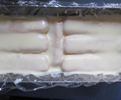 Die Form mit Alu-Folie abdecken und mindestens 5 Stunden in den Kühlschrank stellen. Ich habe die Löffelbiscuits nach ca. 1 Stunde nochmal etwas in die Creme gedrückt.