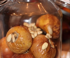Äpfel vorsichtig in einem großen Glas aufschichten. Den Zucker im Wein auflösen. Alle trockenen Zutaten in das Glas füllen. Nun den Wein dazu geben und mit Wodka und Amaretto auffüllen. die obersten Äpfel mit Schaschlikstäbchen so fixieren, dass sie immer mit Flüssigkeit bedeckt sind.