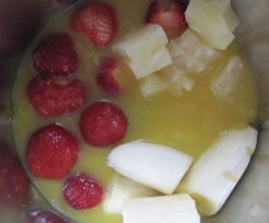 Das Rezept stammt aus der Zeitschrift Chefkoch. Wem der Smoothie zu dickflüssig ist, der gibt noch etwas Saft oder Wasser hinzu. Wer mag, kann vor dem Pürieren auch noch ein paar Eiswürfel hinzufügen. Oder ihr nehmt gefrorene Erdbeeren oder Bananenstücke und lasst sie vorher nicht auftauen. Das müsste ja auch klappen....