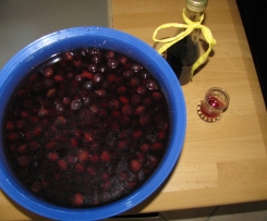 "Mixtopf geschlossen" 10Min/Varomastufe das Wasser aufkochen .Mit dem heißen Wasser die gesäuberten Schlehen übergießen so das die Schlehen ganz unter Wasser sind. Im Siebservierer über Nacht stehen lassen. Es färbt sich jetzt das Waser etwas rot. Nach 24 Stunden die Schlehen abseihen und den Saft (gefärbtes Wasser )in den