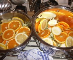 Literweise Sirup. Koche eben die 2. Fuhre. Orangen habe ich noch nie dazu gemacht. Aber schmeckt saulecker.Danke für die Idee.