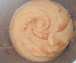 " Modus „Teig kneten“" mit dem Spatel alles nach unten schieben Deckel und Messbecher wieder aufsetzen und 20 sek. auf Stufe 6 kremig Rühren diesen Schritt 2x wiederholen (die richtige Konsistenz siehe Bild)