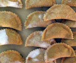 Die Kreise zur Hälfte zusammenklappen, evtl die Ränder mit etwas Wasser befeuchten und fest zusammendrücken.