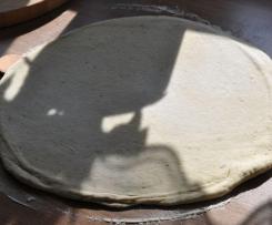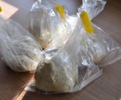 Ich wiege hier immer ca 180 gramm ab und portioniere die für uns ideale Pizzagröße vor, so passen bei uns zwei Pizzen nebeneinander in den Gasgrill (rechteckiger Stein 45x35). Der Teig ergibt so 7 Portionen, etwas kleinere Pizzen.
