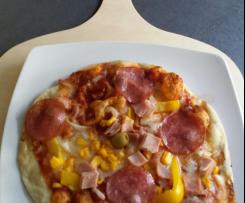 Wir belegen nach dem Ausrollen erst mit selbstgemachter Pizzasoße (Pizzasoße auf Vorrat aus der Rezeptwelt, auch toll zum vorher vorbereiten), dann kommt geriebener Mozzarella drauf und dann den Belag nach Wunsch