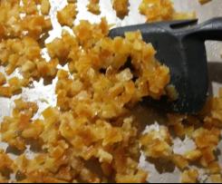 Diese Masse durch das Garkörbchen abgiessen (Saft auffangen z.B. für Mixgetränke)- Die klebrige Masse auf ein mit Backpapier belegtes Blech geben, im leicht geöffneten Ofen bei 100 Grad trockenen während ca. 2 Std. dabei mehrmals mit dem Spatel umrühren