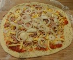 Teig ausrollen und nach belieben belegen, zuerst Soße dann den Käse und zum Schluß eure Zutaten darauf verteilen.