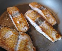 - Die Lachsfilets mit Zitronensaft beträufeln, salzen, pfeffern und in einer Pfanne mit heißem Fett braten.