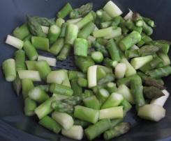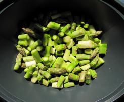 - Das untere Drittel der Spargelstangen schälen. Die holzigen Enden abschneiden und den Spargel in ca. 2 cm lange Stücke schneiden. Die Spargelstücke in den Varomaaufsatz geben.
