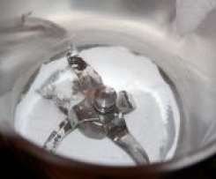 10 Sekunden bei Stufe 10 zu Puderzucker mahlen. 5-6 Minuten bei Varoma und Stufe 1 den Puderzucker zum Schmelzen bringen.