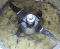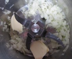 - Zwiebel im Mixtopf 5 Sek./Stufe 5 zerkleinern, mit dem Spatel nach unten schieben und die Butter hinzufügen.
