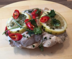 Wer kein Fan von gedünsteten Fisch ist, kann diesen an der Unterseite vor dem Servieren noch scharf anbraten.