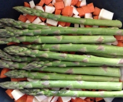 In den Varoma kommen die klein geschnittenen Möhren und Petersilienwurzeln. Auf diesen wird der Spargel verteilt. Den Varoma auf den Thermomix aufsetzen und 30 min/Varoma/St. 1 garen.