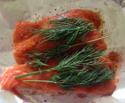 Den Lachs mit dem Olivenöl, Salz und Paprikapulver einstreichen. Den Dill auf dem Lachs verteilen und alles in eine Alufolie einwickeln und auf den obersten Boden des Varomas legen.
