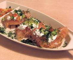 - Dann die Lachs-Käse-Masse mit einem Spritzbeutel oder Löffel darauf geben.