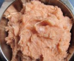 Aufgetautes Lachsfilet in großen Stücken ebenfalls in den Mixtopf geschlossen"Mixtopf geschlossen" geben, 4 Sek. / St. 5 "pürieren" und umfüllen.