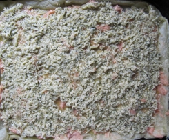 6. Jetzt das Ei-Käse-Gemisch auf den Lachs verteilen.