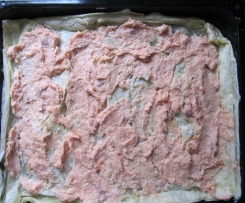 5. Vorgebackenen Blätterteig mithilfe eines Löffels mit der Lachsmasse bestreichen.