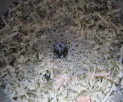 4. Der Mixtopf geschlossen"Mixtopf geschlossen" braucht nicht gespült zu werden. Eier, Gewürze und Dill hinein geben und 5 Sek. / St. 5 verrühren. Käse hinzufügen und 5 Sek. / St. 4. verrühren.