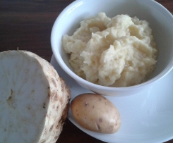 5. Wasser im Wasserkocher aufkochen, in den Mixtopf einwiegen, 1 TL Salz zugeben. Garkörbchen einhängen, Kartoffeln und Sellerie einfüllen. 20 Minuten / Varoma / 1 garen. Mixtopf leeren, Milch und Butter einfüllen, 2 Minuten / 100° / 1 erhitzen. Rühraufsatz einsetzen, Kartoffeln, Sellerie und Gewürze zugeben und 10 Sekunden / 3 zerkleinern.