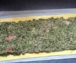 Die Füllung gleichmäßig (mit der Rückseite eines Esslöffels) auf den Teig streichen. Oben und unten einen ca. 2 cm breiten Rand frei lassen und diesen mit dem aufgefangenen Eigelb bestreichen. - Den oberen Teigrand umschlagen, dann der Länge nach fest einrollen und den unteren Teigrand gut andrücken.