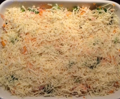 Ich habe auch die Kartoffeln im Körbchen und die Brokkoliröschen im Varoma zubereitet, aber zu allererst habe ich den Käse gerieben. Am Schinken etwas gespart, das Brühpulver durch wenig Salz ersetzt!