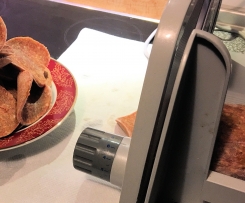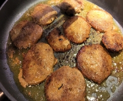Nachdem die Masse fest geworden ist, etwas antauen lassen und in dünne Scheiben schneiden. - Das Fleisch in einer Pfanne goldbraun von beiden Seiten anbraten.