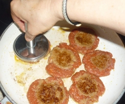 Alle Zutaten in den Mixtopf und ca. 20-30 Sek./St.5 alles miteinander vermischen. Nun ca. 12 Frikadellen formen und in einer besch. Pfanne ohne Fett ausbraten. Damit die Burger schön flach werden, drücke ich sie mit einem Plattiereisen flach.