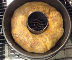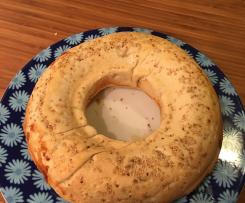 Komplett mit Eigelb bestreichen, mit Sesam bestreuuen und circa 18-20 Minuten auf der unteren Schiene backen. - Auf einen großen Teller stürzen und servieren.