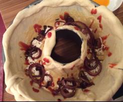 Restlichen Speck und Zwiebelringe auf dem Hackfleisch verteilen und mit Scheibenkäse belegen. - Den Teig vom Rand über der Füllung Falten und mit etwas Ei bestreichen damit es besser zusammenhält.