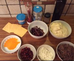 Die Hälfte vom Mozzarella verteilen, Hälfte vom Speck und den Zwiebeln dazu. - Hackfleisch gleichmäßig verteilen.