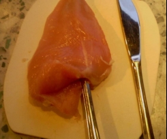 1. Die Füllung passt in 6 bis 8 Hähnchenbrustfilets (je nach Anzahl der Filets sind sie sehr dick und prall gefüllt). Zuerst schneide ich in die Filets mit einem langen Messer vorsichtig eine Tasche von der kurzen Seite her (siehe Foto).